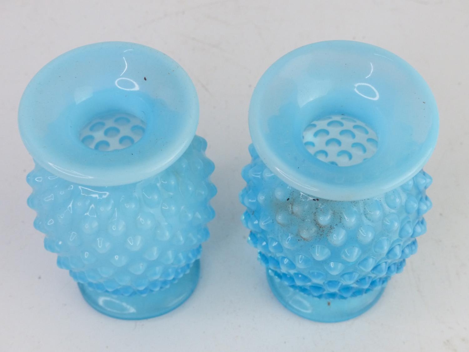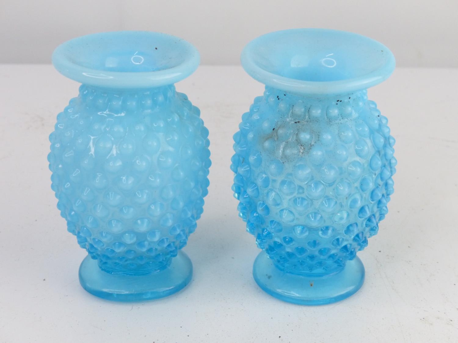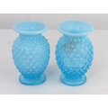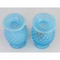 A pair of vintage blue glass vases with hobnail design.