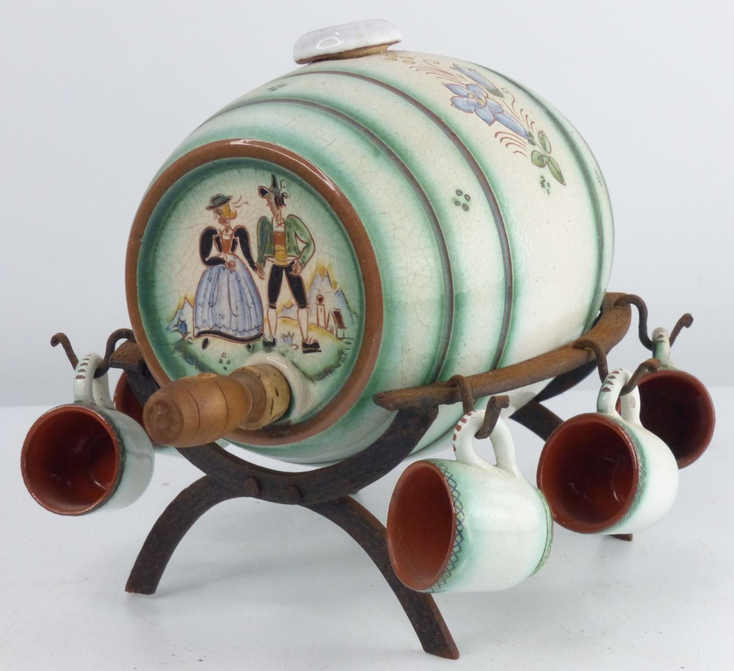 A vintage/ retro barrel liqueur set, modelled as a barrel on stand.