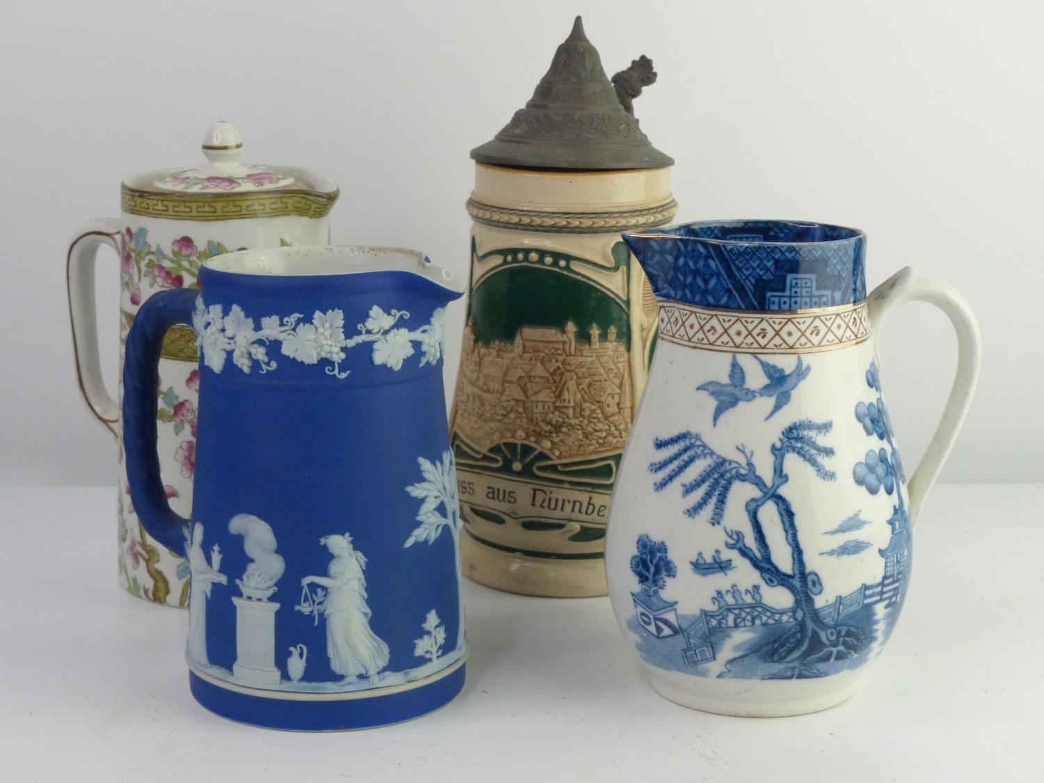 A collection of 3 decorative antique jugs & a German beer stein.