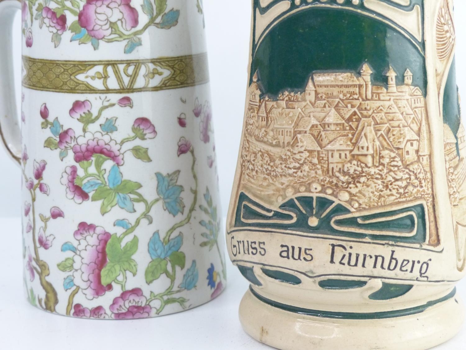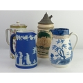 A collection of 3 decorative antique jugs & a German beer st...