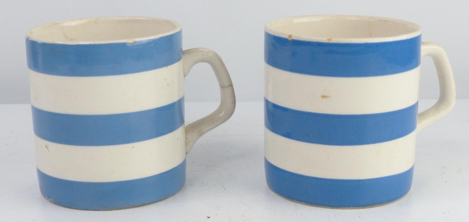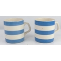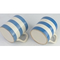 A pair of vintage blue & white striped mugs.